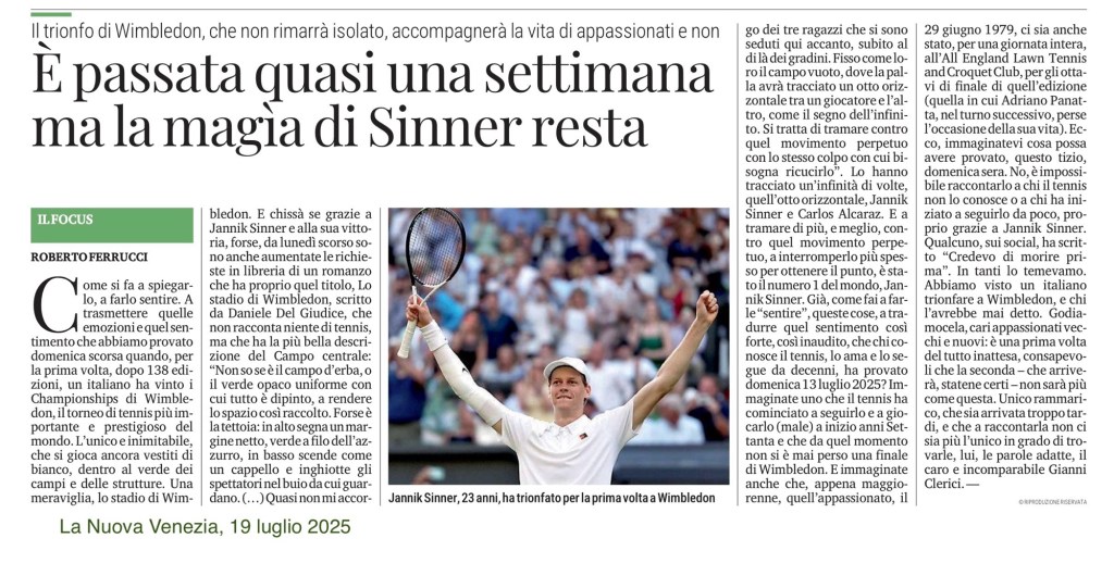 Già, come fai a farle “sentire”, queste cose, a tradurre quel sentimento così forte, così profondo, così inaudito, che chi conosce il tennis, lo ama e lo segue da decenni, ha provato domenica 13 luglio 2025? Immaginate uno che il tennis ha cominciato a seguirlo e a giocarlo (male) a inizio anni settanta e che da quel momento non si è mai perso una finale di Wimbledon, la gran parte viste al mare, a Jesolo, perché luglio era il mese della “villeggiatura”, e prima è stato su un piccolo televisore portatile, in bianco e nero, che sembrava un casco da motocicletta, dove la pallina riuscivi a malapena a intuirla, poi nella saletta dell’Hotel Trento, che aveva uno dei primi televisori a colori e sembrava quasi di essere lì, sulle tribune verdi del Campo centrale. E immaginate anche che, appena maggiorenne, quell’appassionato, il 29 giugno 1979, ci sia anche stato, per una giornata intera, all’All England Lawn Tennis and Croquet Club, per gli ottavi di finale di quell’edizione (quella in cui Adriano Panatta, nel turno successivo, perse l’occasione della sua vita). Ecco, immaginatevi cosa possa avere provato, questo tizio, l’altra sera. No, è impossibile raccontarlo a chi il tennis non lo conosce o a chi ha iniziato a seguirlo da poco, proprio grazie a Jannik Sinner. Qualcuno, sui social, ha scritto “Credevo de morì prima”, parafrasando quello striscione che un tifoso giallorosso, mostrò al mondo intero il giorno in cui Francesco Totti si ritirò dal calcio e che diceva “Speravo de morì prima”. Abbiamo visto un italiano trionfare a Wimbledon, e chi l’avrebbe mai detto. Godiamocela, cari appassionati vecchi e nuovi, soprattutto perché è una prima volta a cui credevamo di non assistere mai, consapevoli che la seconda – che arriverà, statene certi – non sarà più come questa. Unico rammarico, che sia arrivata troppo tardi, e che a raccontarla non ci sia più l’unico in grado di trovarle, lui, le parole adatte, il caro e incomparabile Gianni Clerici.