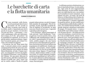 Le abbiamo portate a destinazione, sabato, le barchette di Gaza. Un atto simbolico. Agli occhi di certi rappresentanti delle istituzioni, un atto inutile. Intanto, però, ieri, delle barche vere, con centinaia di tonnellate di aiuti umanitari, sono salpate sul serio, via mare, dai porti di Genova e di Barcellona (dove hanno dovuto temporaneamente rientrare a causa del maltempo), e saranno raggiunte, fra qualche giorno, da altre imbarcazioni che partiranno dalla Sicilia e dalla Tunisia. È la Global Sumud Flotilla, la più grande missione umanitaria spontanea di sempre. È il mondo intero – ci sono a bordo delle varie imbarcazioni volontari di 44 paesi diversi – che sfida governo e esercito israeliano, e non lo fa con le armi, lo fa con delle barche, alcune a vela, piene di viveri. Visti i precedenti, non c’è da essere fiduciosi sull’esito della missione. Già altre barche sono state bloccate e gli equipaggi arrestati nei mesi scorsi. Ma questa volta è diverso, la Global Sumud Flotilla è un esercito pacifico, multinazionale, multicolore. Porta cibo e medicine a chi è lasciato intenzionalmente morire di fame e di stenti. Osasse, l’esercito israeliano, bloccare le barche di tutto il mondo con la forza, continueremo a vivere nella nostra indifferenza? Ci renderemo finalmente conto – tutti – di che cosa sta succedendo a Gaza?